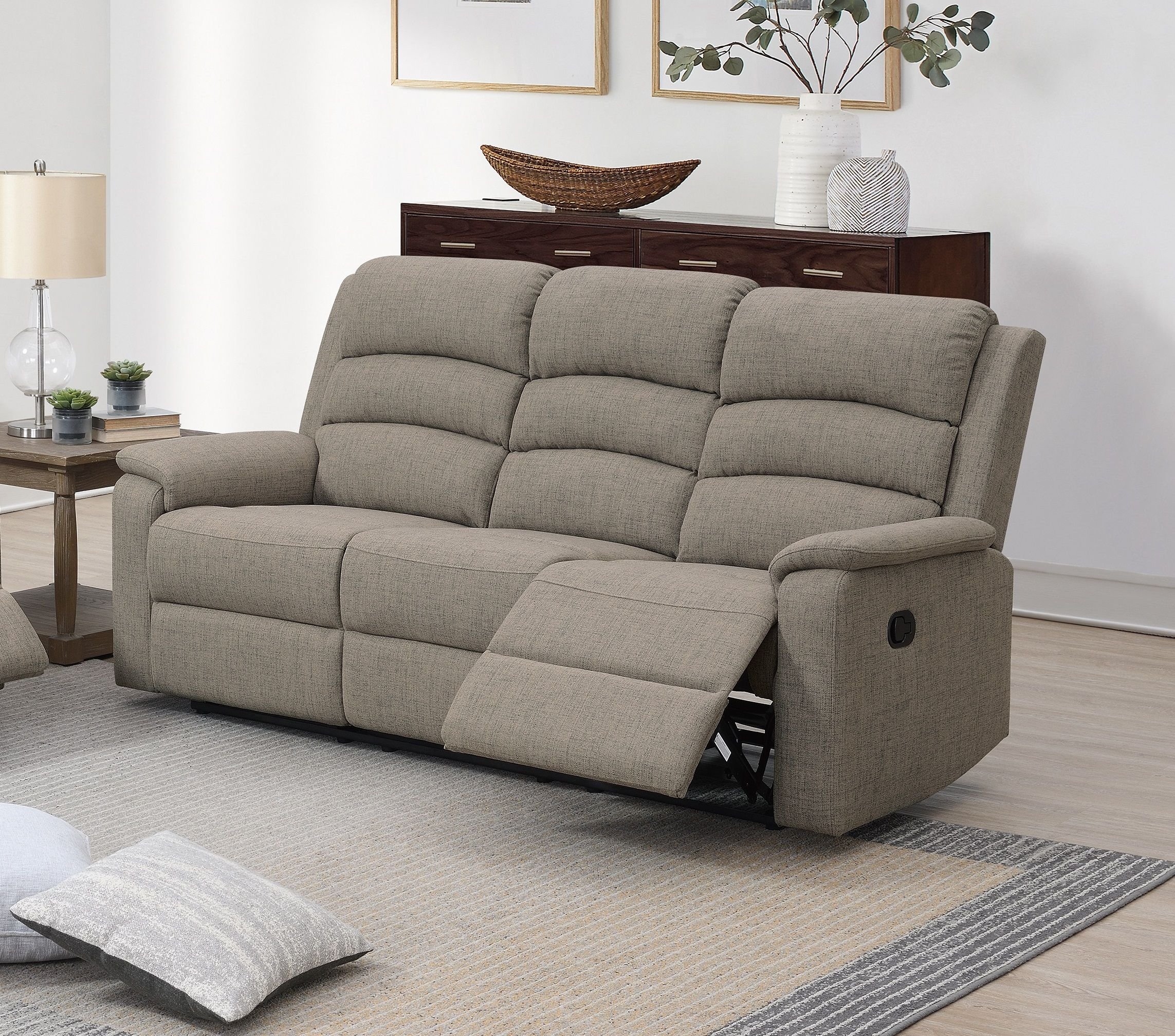 Relax with the family and enjoy a movie night with this 3-seater manual recliner. Designed to provide maximum comfort and support, featuring patted headrests and armrests. Available in Light Brown and Dark Gray (Burlap Fabric)Product Dimensions:-