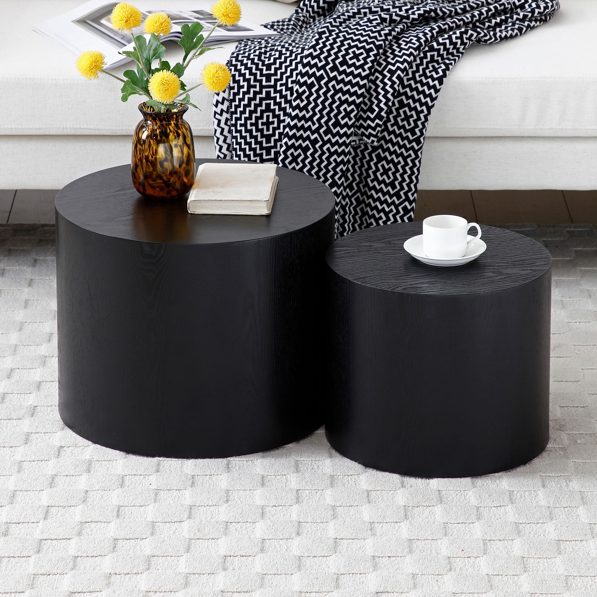 Round Coffee Table Set of 2, Nesting Coffee Tables for MDF with veneer .for living room,office,bedroom,Natural, 4Colors BLACK