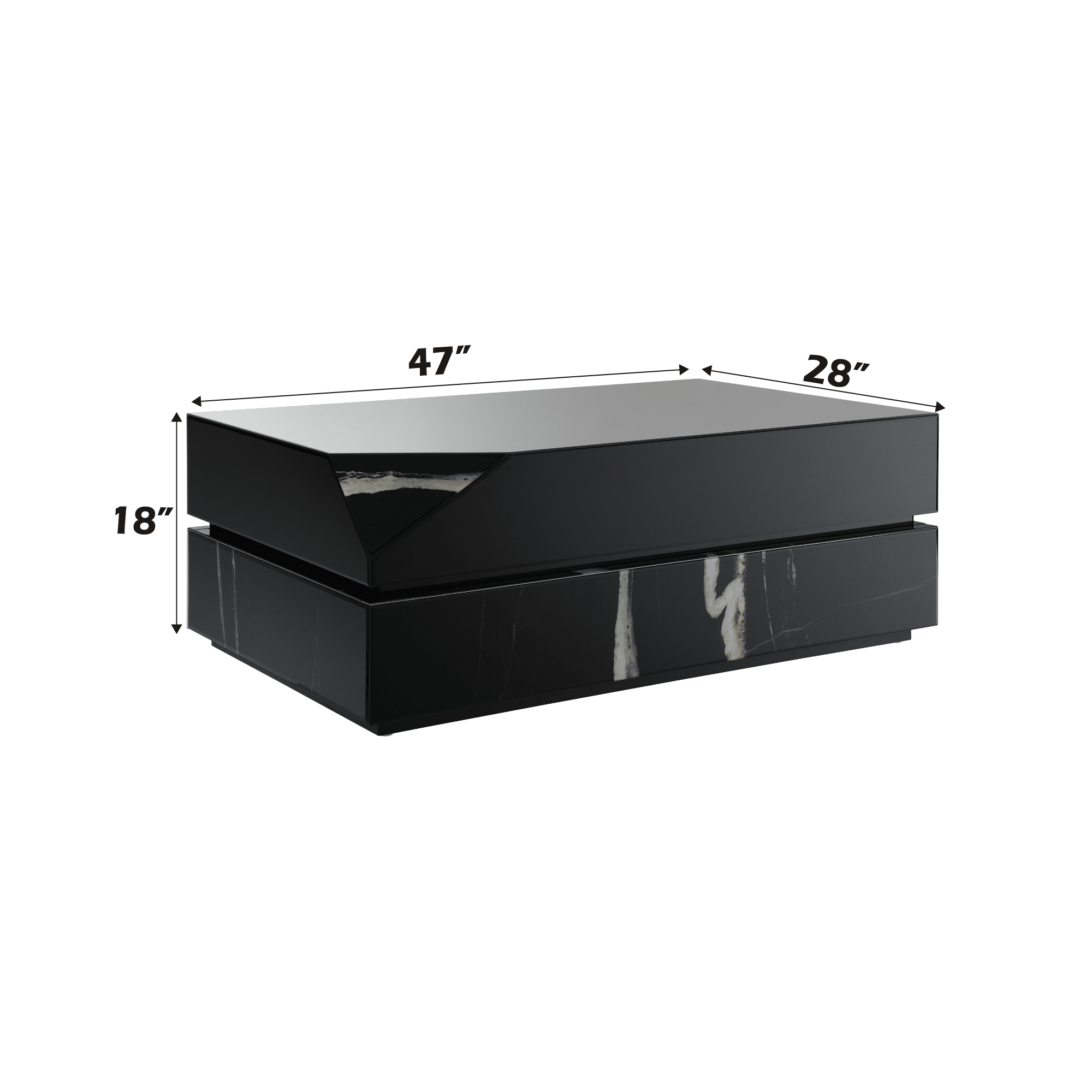 This black mirrored coffee table adds a striking modern flair to any living space with its sleek, reflective finish and elegant marble grain design.