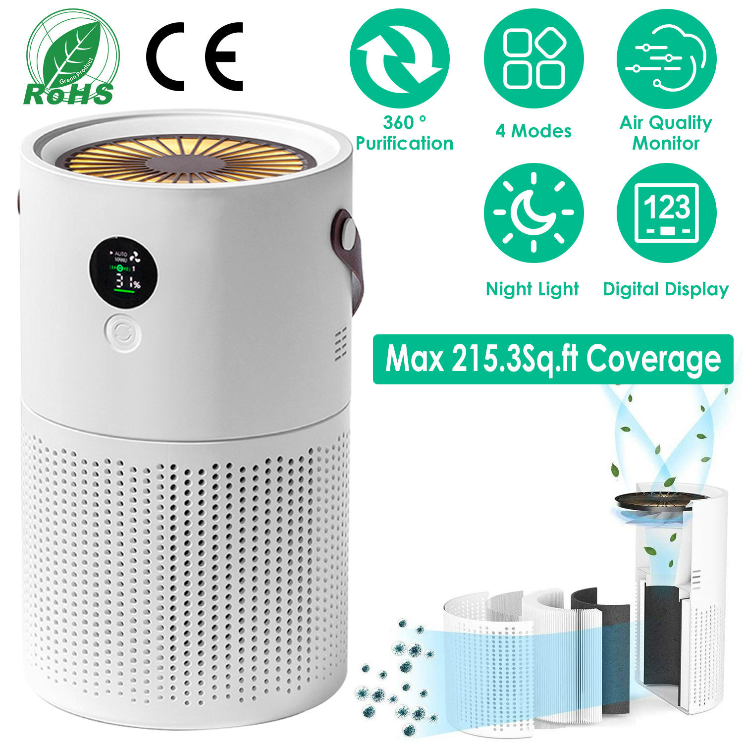 Does the air pollution bother your family? Our air purifier can provide 360 º purifying system and cover 215.3sq.ft area, effectively killing germs and offering you a clean air atmosphere. Come with a handle, you can take our purifier everywhere you go, such as, kitchen, bedroom, living room, car, office, parlor, basement, garage etc.. Fully charged for about 7 hours, work up to 20 hours. Features with night light, you can read books at night while enjoying good air quality. Auto monitor surrounding air quality, efficient and convenient.
