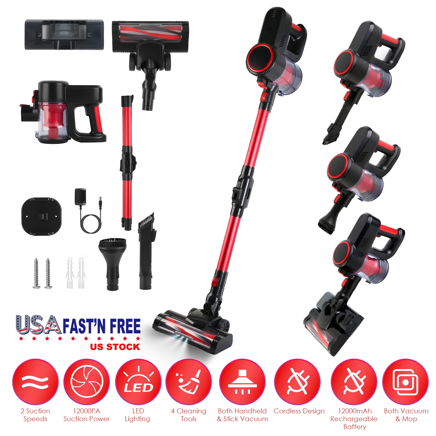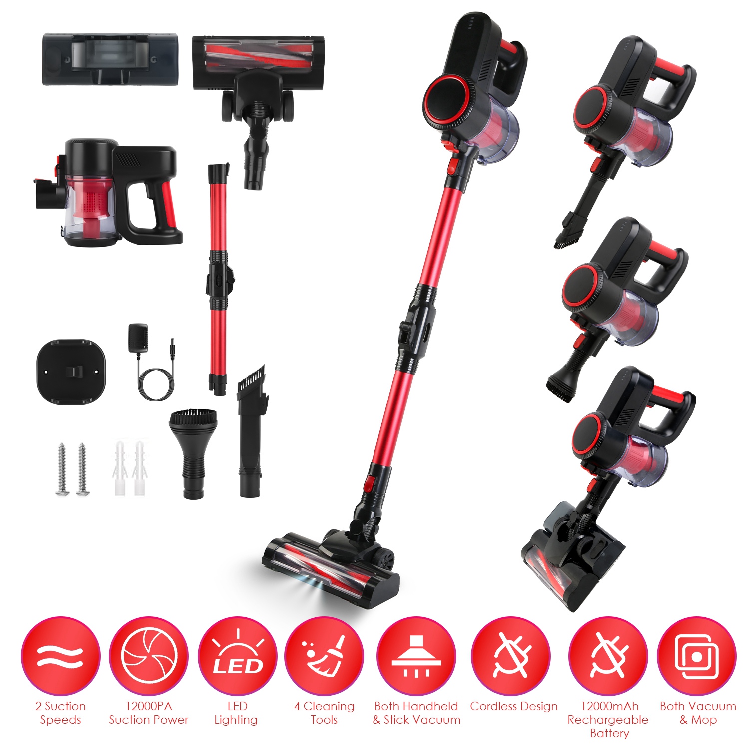 Built in 100W powerful pure copper burshless motor and featured with 2 speeds, this vacuum cleaner can deliver up to about 12000PA suction power to easily remove debris, dust, pet hair. Besides, the outer red filter can block out most particles and the built-in washable High Efficiency Particulate Air Filter can collect fine dust and lock dirt debris in a dust cup easily. And built-in LED light makes it easy for you to see and clean even in the darkest corners or under bed. 4 Different cleaning tools including 2-in-1 long crevice tube, brush nozzle, LED Motorized Cleaning Head and 2-In-1 dusting brush with water tank, can better suit your cleaning needs. You can also use it as a handheld vacuum or stick vacuum with the foldable extension rod. And easy to hang it on the wall with the included mount bracket after each use.