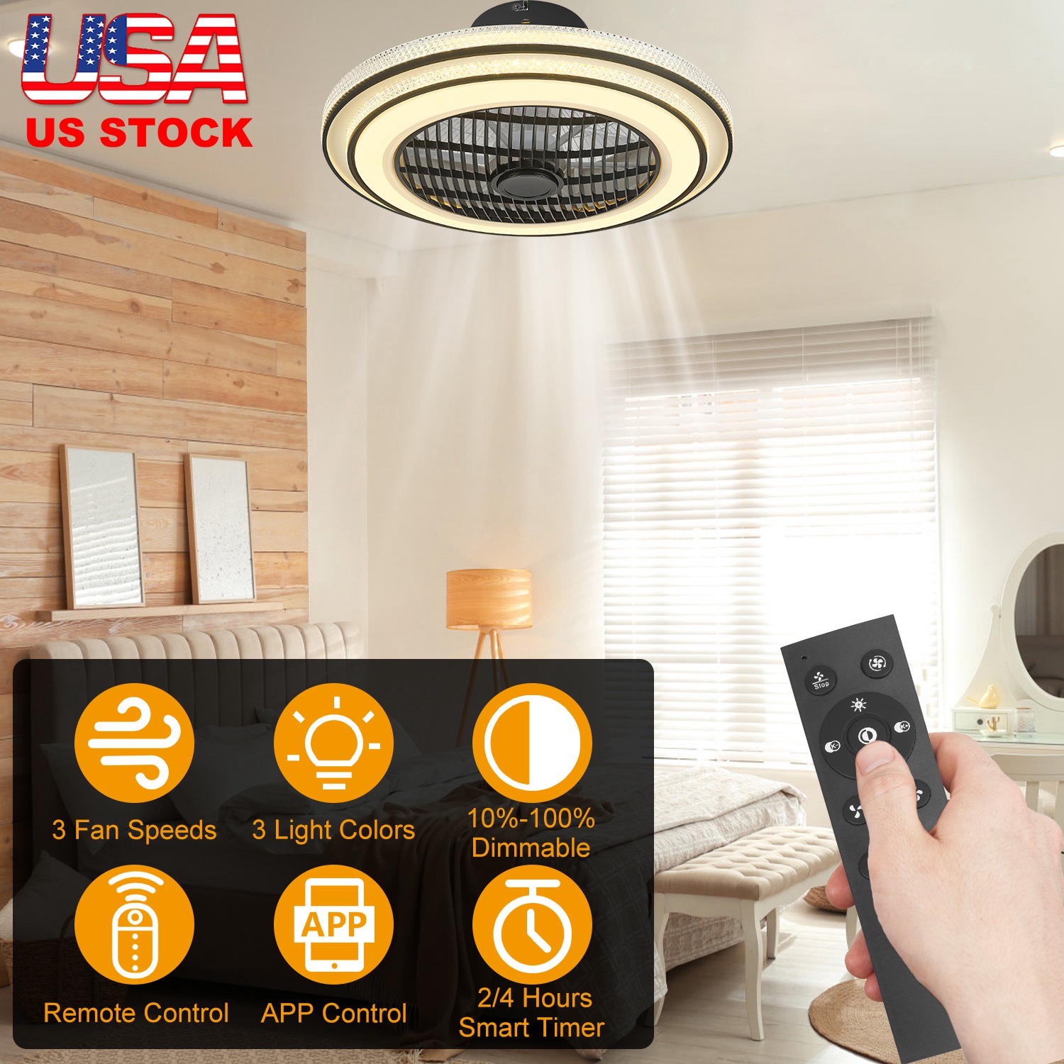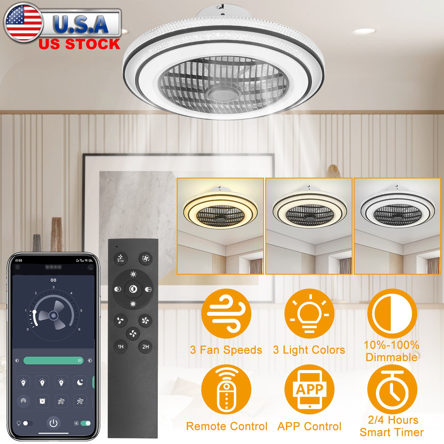 This 2-in-1 ceiling LED fan is a must-have in your home in summer and take care of your family! You can easily adjust 3 fan speeds, 3 light colors including cool white, nature white and warm white, LED brightness and 2-hour/4-hour timer through the handheld remote control or via phone APP, which is super convenient and considerate. Perfect for kitchens, bedrooms, leisure areas, baby care rooms, living rooms, attics, cloakrooms, farmhouses and other places that require air circulation.