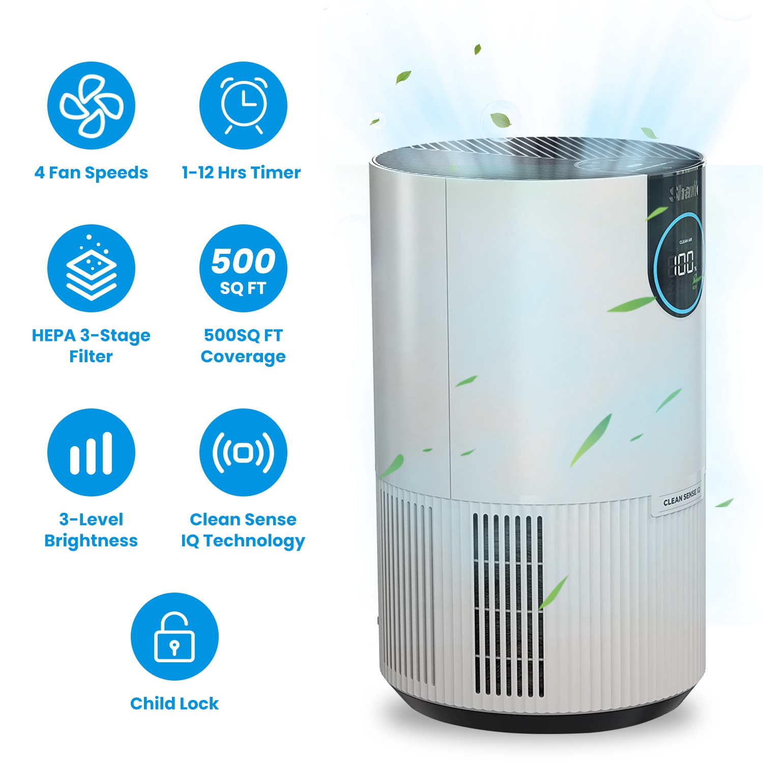 Say goodbye to the indoor air pollution and take care of your whole family with this Shark Air Purifier with True HEPA 3-Stage Filter! Adopted with Shark’s Clean Sense IQ technology, an air quality sensor, it can detect three particle sizes: PM1, PM2.5, and PM10, shows the air quality in real time via blue/amber/red indicator, and purify the air automatically with different fan speed under Auto Mode. It also features 1-12hrs timer, child lock, 4 fan speeds, 3-level brightness and more. With true HEPA filtration system, great to capture 99.98% of large, small, & micro-sized particles. Powerfully purifies spaces up to 500 square feet, perfect for homes and offices. Simply turn it on and maintain a clean and peaceful environment, breathe clean, crisp air and give families health!